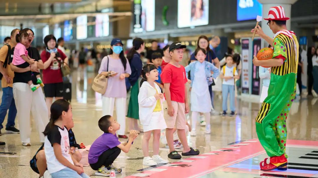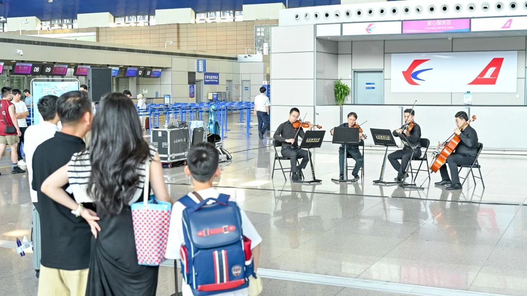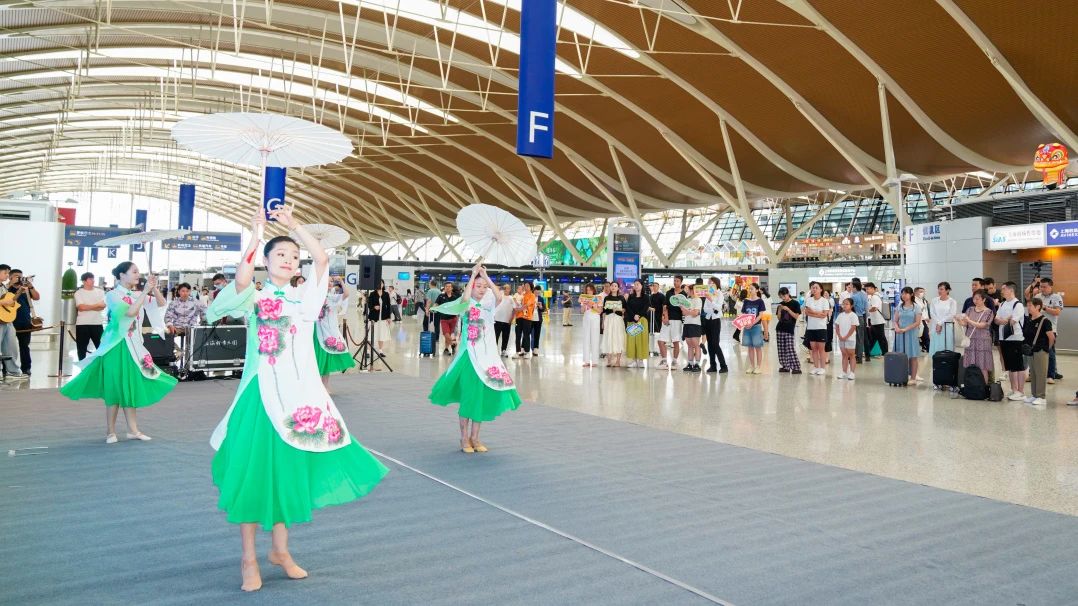 7月28日,浦東機(jī)場圍繞“中國樣·China Young”上海機(jī)場人文品牌打造,聯(lián)合上海輕音樂團(tuán)啟動“快樂一夏,‘暑’不盡的美好”暑運(yùn)周周演活動。當(dāng)天在兩座航站樓和衛(wèi)星廳的出發(fā)、候機(jī)區(qū)分別舉行了4場精彩的文藝演出。開幕演出在T2航站樓出發(fā)公共區(qū)域上演,傳統(tǒng)戲曲《川劇變臉》中的非遺技藝,舞蹈《江南水韻》《飛天》演繹出的江南美學(xué)與敦煌意象,吸引旅客紛紛駐足欣賞、拍照留念。其他場次也精心策劃了弦樂四重奏《梁?!贰犊ㄞr(nóng)》、古箏獨(dú)奏《茉莉花》《漁舟唱晚》等節(jié)目,機(jī)場航站樓化身成為音樂廳、大舞臺,傳播紅色文化、海派文化、江南文化的生動窗口。